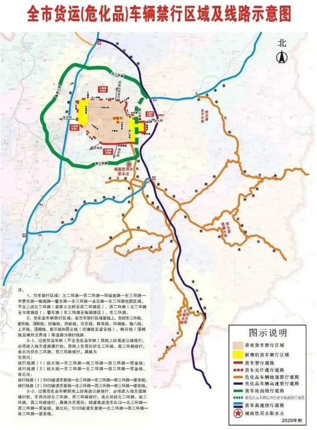 1.禁行線路:在上述貨運車輛禁行區域基礎上,增加東三環路、諸東線、浬斯線、街璜線、街新線、石東線、陳吳線、環湖線、璜八線、上齊線、浬鬧線、新王線和周義線(街璜線至諸安線)、楓谷線(浬鬧線至嵊州交界處)等道路為禁行線路。
