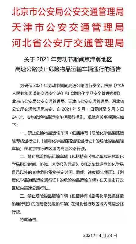 為確保2021年五一勞動(dòng)節(jié)期間高速公路通行安全,根據(jù)《中華人民共和國(guó)道路交通安全法》和《危險(xiǎn)化學(xué)品安全管理?xiàng)l例》,4月23日,北京市公安局公安交通管理局、天津市公安交通管理局、河北省公安廳交通管理局發(fā)布《關(guān)于2021年勞動(dòng)節(jié)期間京津冀地區(qū)高速公路禁止物品運(yùn)輸車(chē)輛通行的通告》,通告決定,自2021年5月1日零時(shí)至5月5日24時(shí),實(shí)施物品運(yùn)輸車(chē)輛限行措施。
