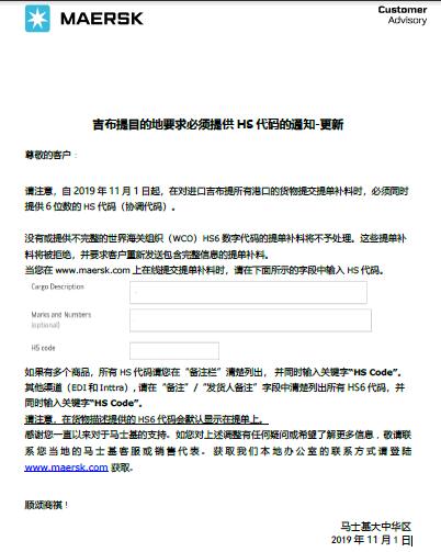 近日吉布提海關提出,自2019年11月1日起貨物進入吉布提所有港口均需要在提單上顯示HS代碼。MSK近日已經發出通知。
